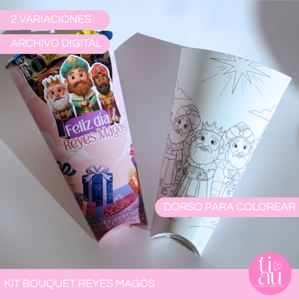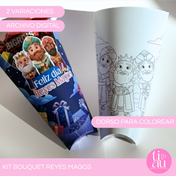 Lo mejor de este diseño es su versatilidad: mientras que el frente luce a los Reyes Magos a todo color, la parte posterior incluye una ilustración para colorear, ¡asegurando doble diversión para los más pequeños!